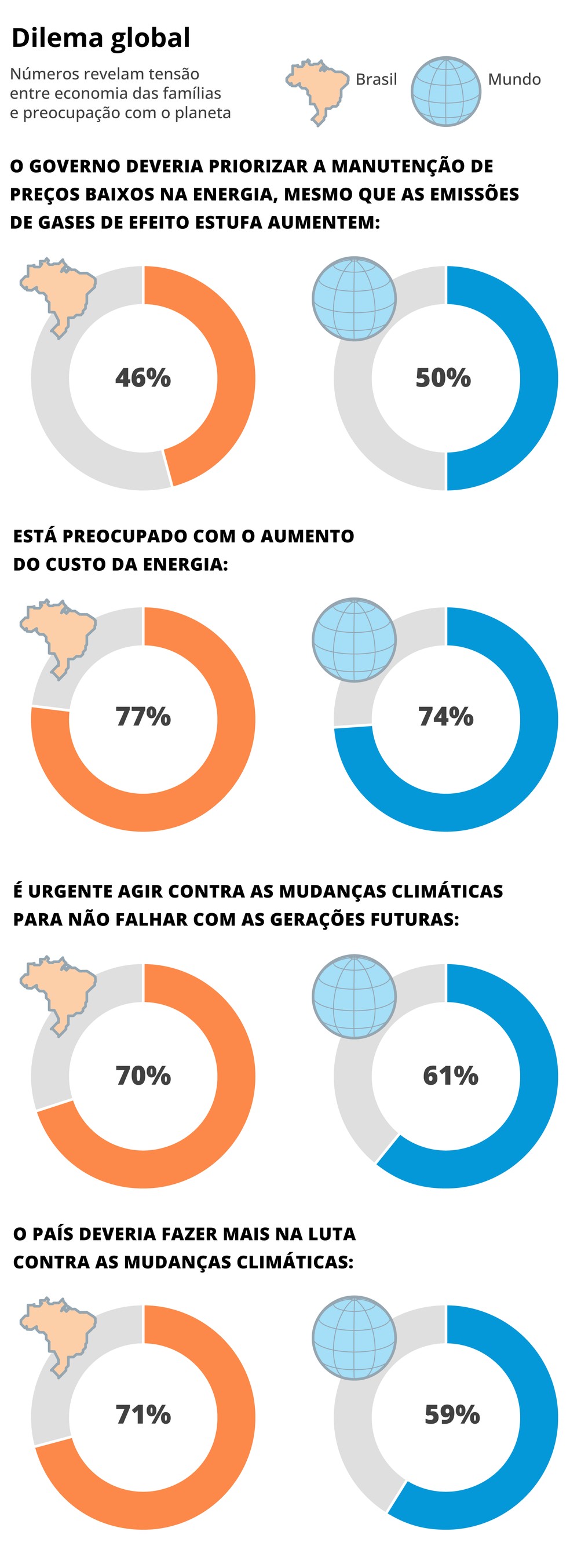 Quase metade da população brasileira (46%) apoia que o governo brasileiro priorize preços baixos da energia,mesmo que isso aumente as emissões de gases poluidores. O percentual é próximo à média global (50%). É o que mostra novo levantamento do instituto Ipsos divulgado ontem. A pesquisa “People and Climate Change” aponta também que o aumento do valor da tarifa é motivo de preocupação para 77% do país.