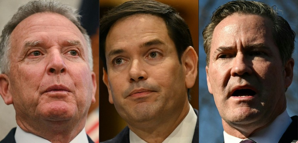 Delegação americana para negociar a paz entre Ucrânia e Rússia: Enviado especial dos EUA para o Oriente Médio,secretário de Estado dos EUA,Marco Rubio,e conselheiro de Segurança Nacional da Casa Branca,Mike Waltz — Foto: Jim WATSON and ANDREW CABALLERO-REYNOLDS / AFP